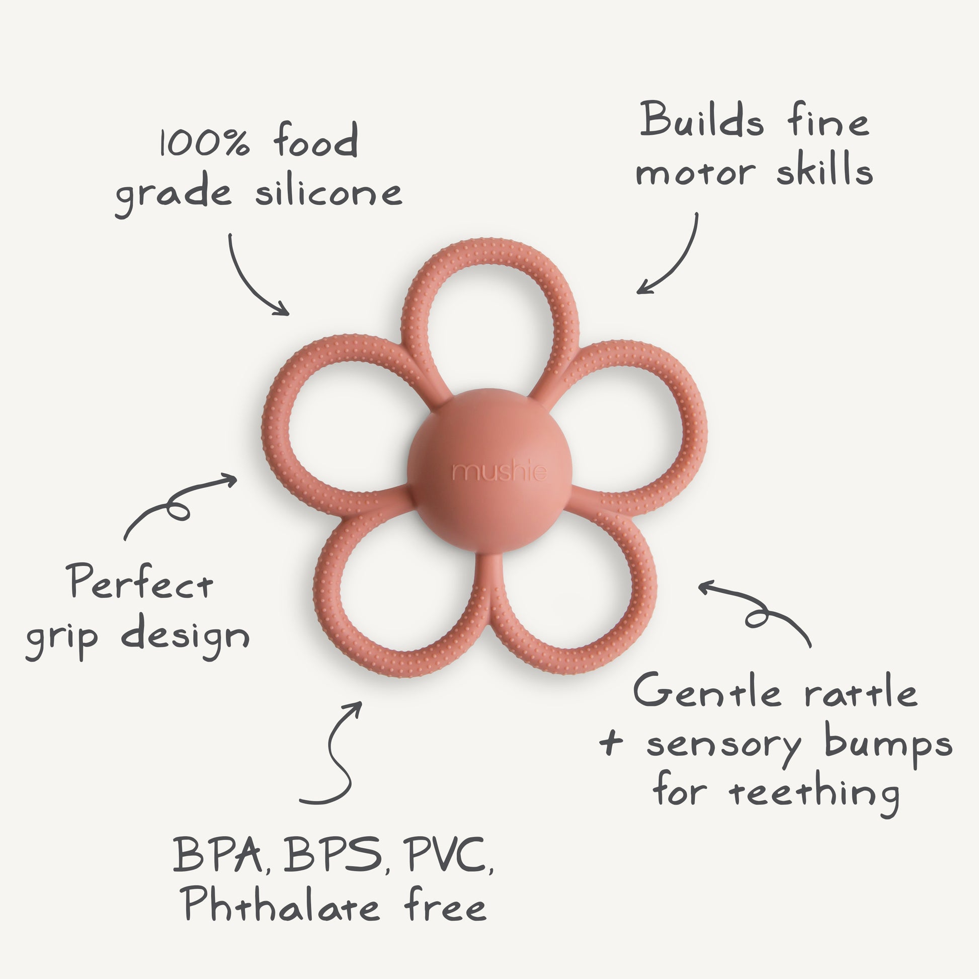 Inspired by nature and designed with functionality and comfort in mind, our silicone Daisy Rattle Teether features a playful flower shape and built-in rattle. The cheerful sound engages baby’s auditory senses for added soothing relief. With handles that are easy for small hands to grasp and a textured silicone surface that massages gums, our rattle teethers are perfect for your little one’s teething journey. Made from 100% non-toxic, BPA free, food-grade silicone.